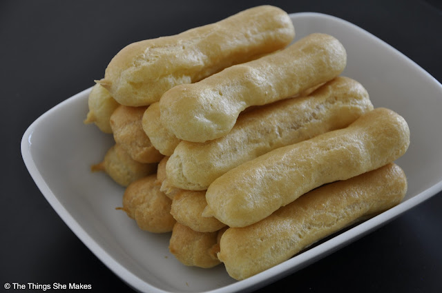 Using the same recipe mix, but quartered, I made my pastry, filling a piping bag but not adding a nozzle. This gave me a circle around 2cm in diameter to pipe out long rows of pastry, using water to help flatten down the ends and round the eclairs: